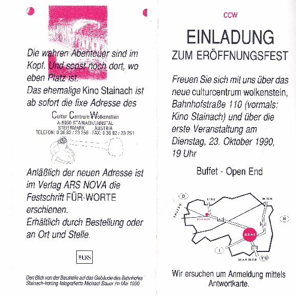 Das alte Kino in Stainach wurde in den 80er Jahren nur mehr in den Sommermonaten (sporadisch) bespielt. Der Eigentümer Johann Deubler bespielte das Kino in dieser Art letztmals im Sommer 1987 und beabsichtigte dessen Verkauf. Im Jahr 1988 trat das Culturcentrum Wolkenstein an seine Fördergeber heran, um anhand von Plänen und einem Modell der (im Architektenwettbewerb siegreichen) Grazer Architekten Riegler/Riewe die Möglichkeiten des Ankaufes und des Umbaues auszuloten. Im Jahre 1989 konnte der Ankauf erfolgen und im Jahr 1990 der Umbau durchgeführt werden. Der in der Zeitschrift Da schau her Ausgabe 2/1989 erschienene Beitrag zum Umbau des CCW kann hier nachgelesen werden.