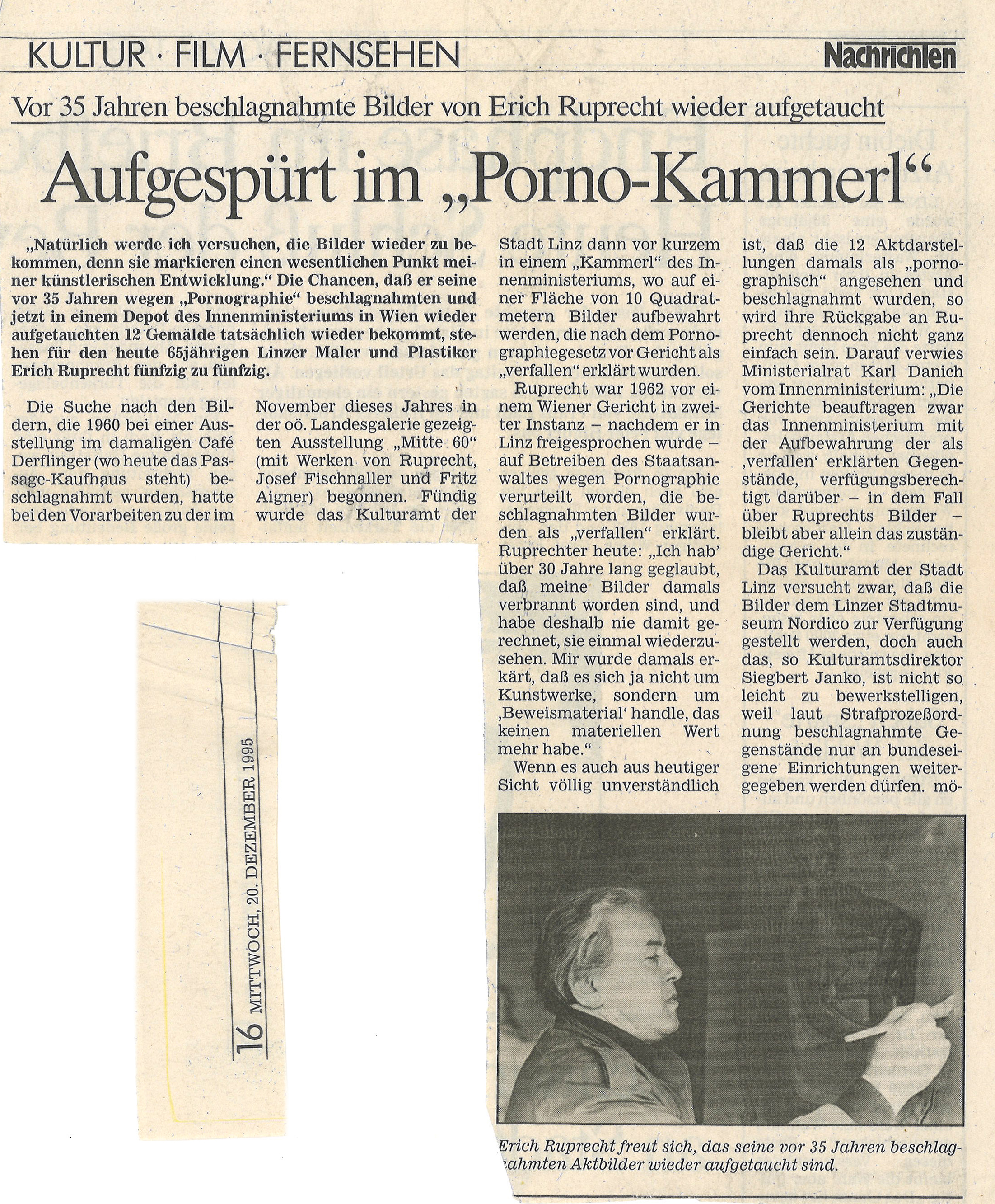 Dort wurden im April 1960 über hundert Bilder des „derzeit völlig unbekannten Malers“ Erich Ruprecht ausgestellt. Bereits vor der Vernissage am 7. April 1960 ging ein anonymer Hinweis bei der Linzer Polizeidirektion ein, in dieser Ausstellung seien unzüchtige Bilder zu sehen.