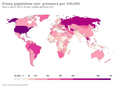 Der aktuelle Stand aus der Liste der Länder nach Gefängnisinsassen weist für 2019 in den USA 2.068.000 Häftlinge (629 von 100.000) aus.